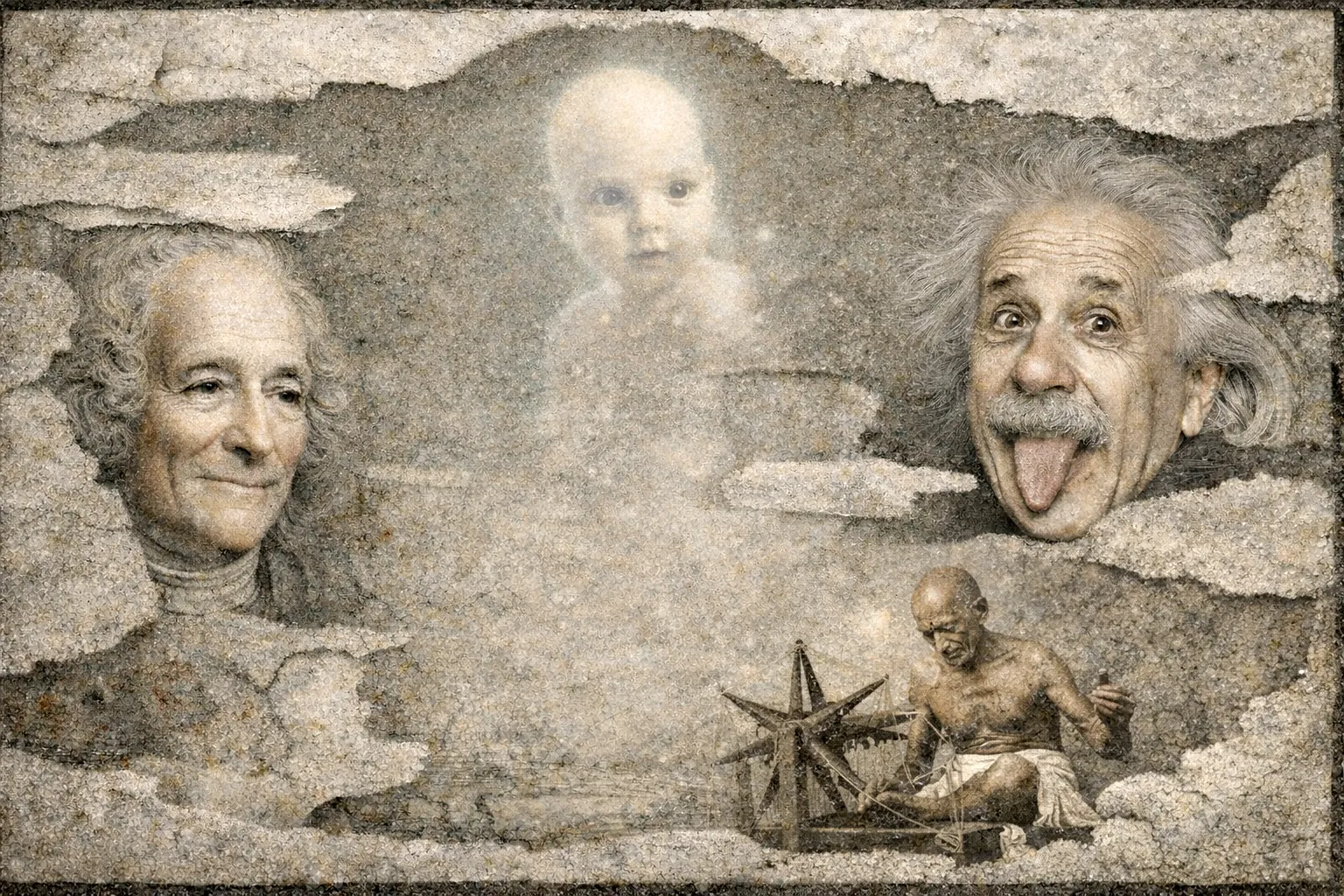Von hier aus ergibt sich fast von selbst die Leichtigkeit, Beispiele zu finden: Einstein mit herausgestreckter Zunge (man kann nicht sprechen, während man die Zunge herausstreckt – und es ist eine endgültige Verweigerung des Sprechens), Gandhi am Spinnrad, mit seinem Schweigegelübde, die Mutter eines jeden von uns – als jene, die sich zwischen dich und jede Gefahr stellt, noch bevor sie ein Wort gesagt hat, die Mona Lisa, die Büste Voltaires, das kosmische Baby aus „2001“… Übrigens – beginne ich nicht abzuschweifen?